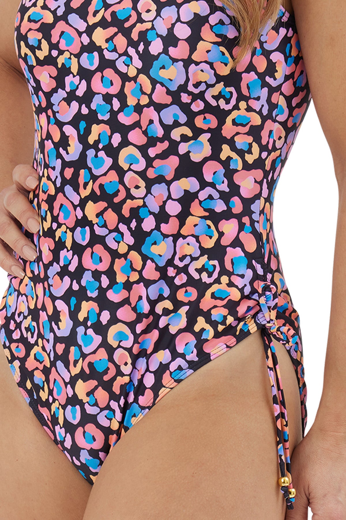 It's designed for comfort and style, with tummy-flattering ruched side panels and a straight neckline. We've added on trend side ties with smart gold ends for a touch of designer style. You'll feel supported with our internal shelf bra with foam cups and wide straps. And don't forget the special touch of glamour with our gold Oyster Bay tab!