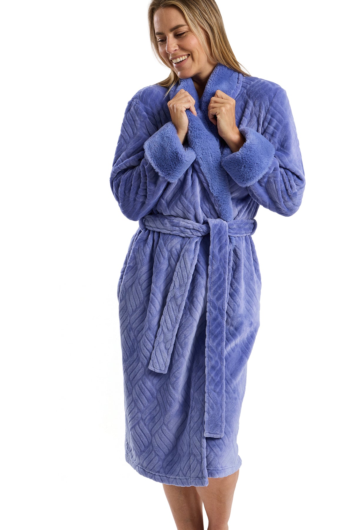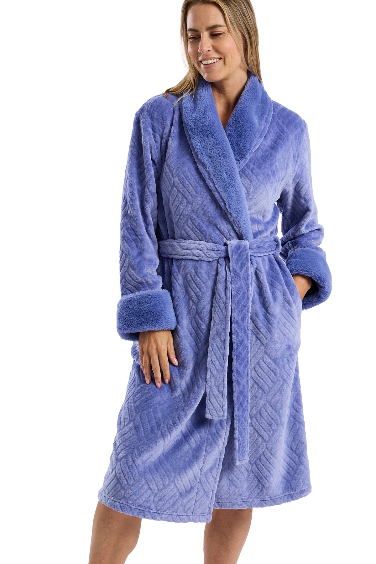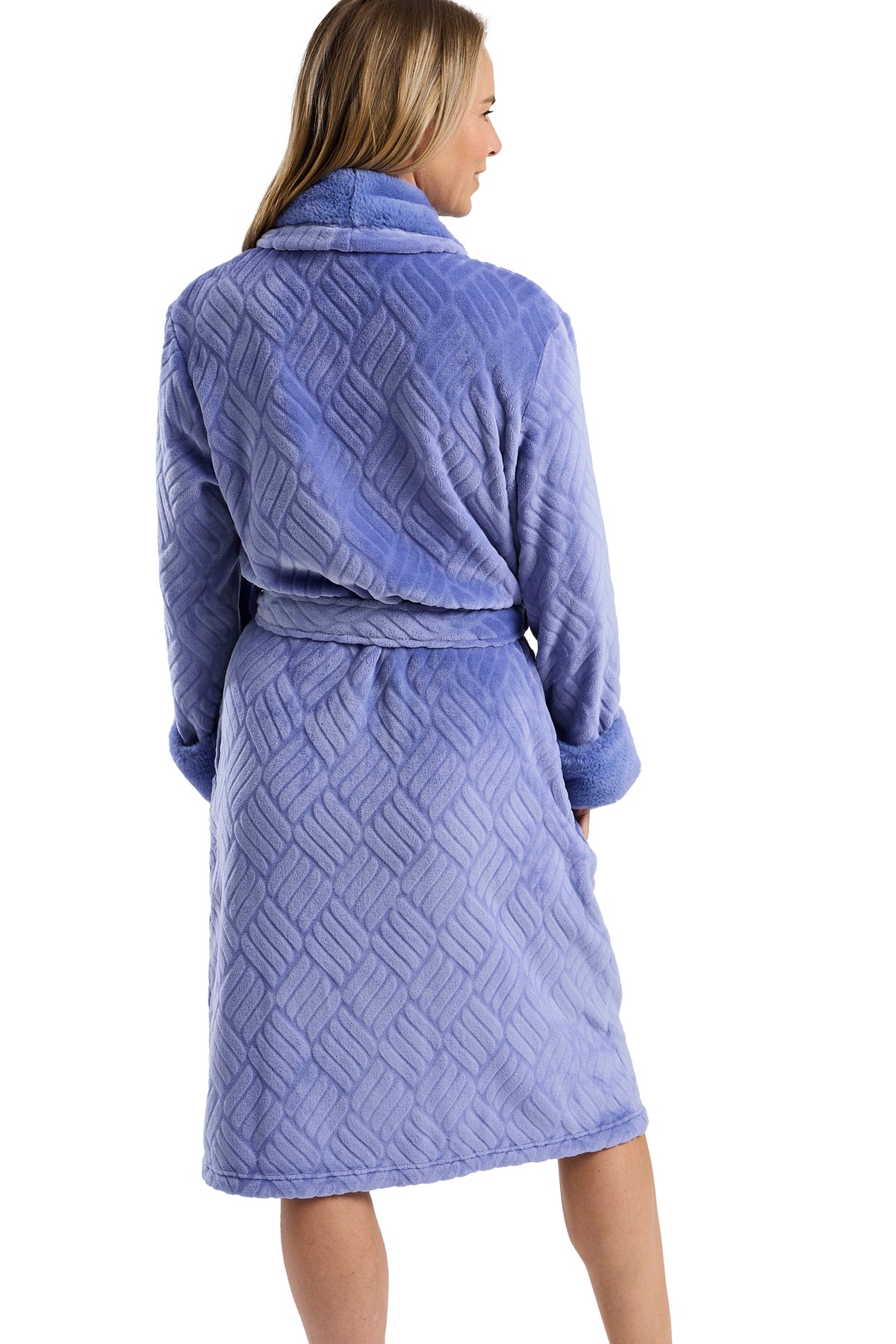 Treat yourself or a loved one to the gentle luxury of our embossed fleece shawl collar robe a perfect gift for ladies who appreciate warmth, style, and luxury. Crafted from silky-soft fleece with a subtle geometric embossed finish, this robe offers a flattering fit and soothing comfort for everyday relaxation. The elegant shawl collar and cuffs are trimmed with plush faux fur fleece, adding a refined touch that feels as beautiful as it looks.