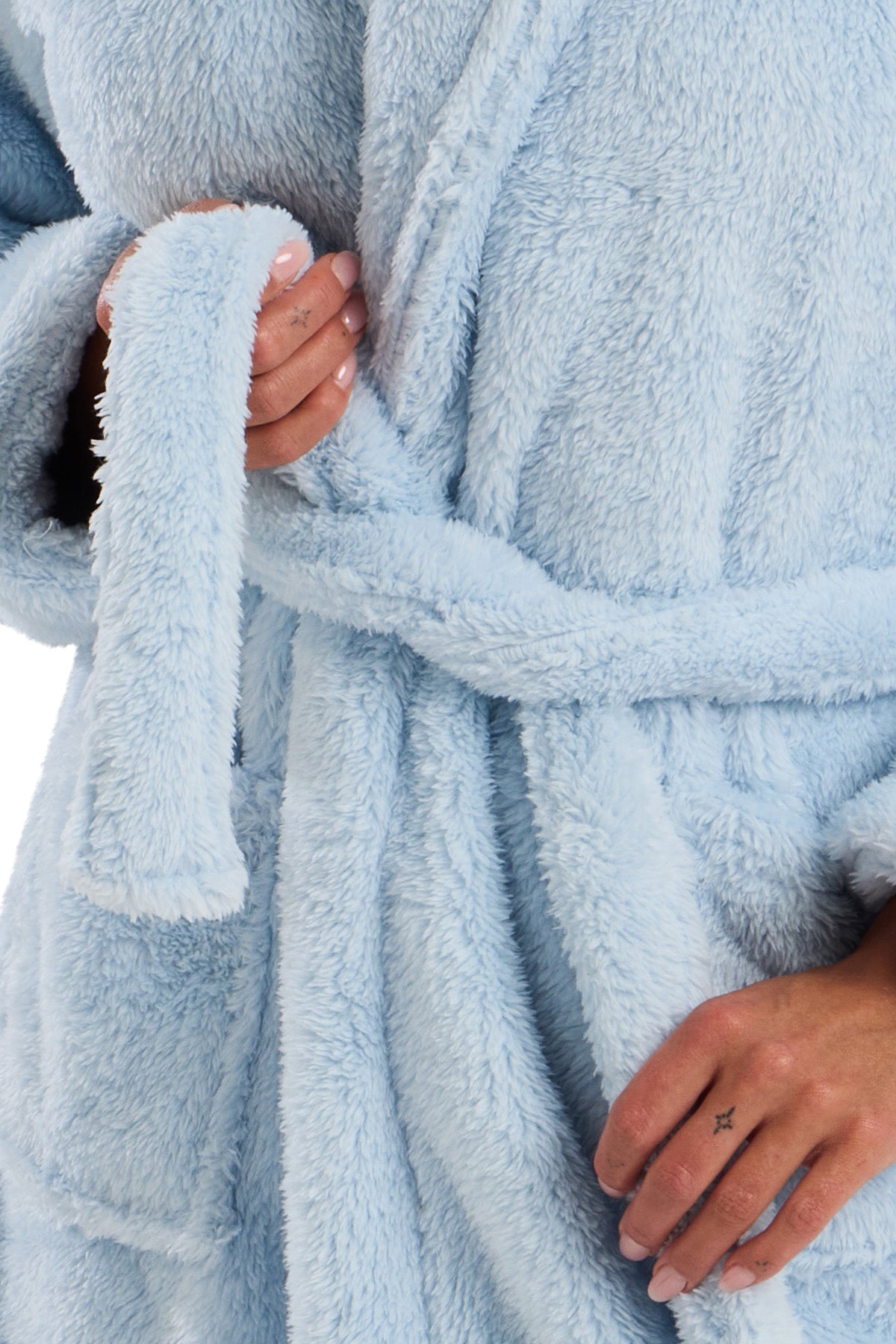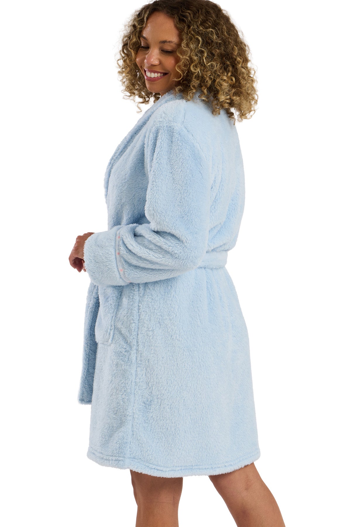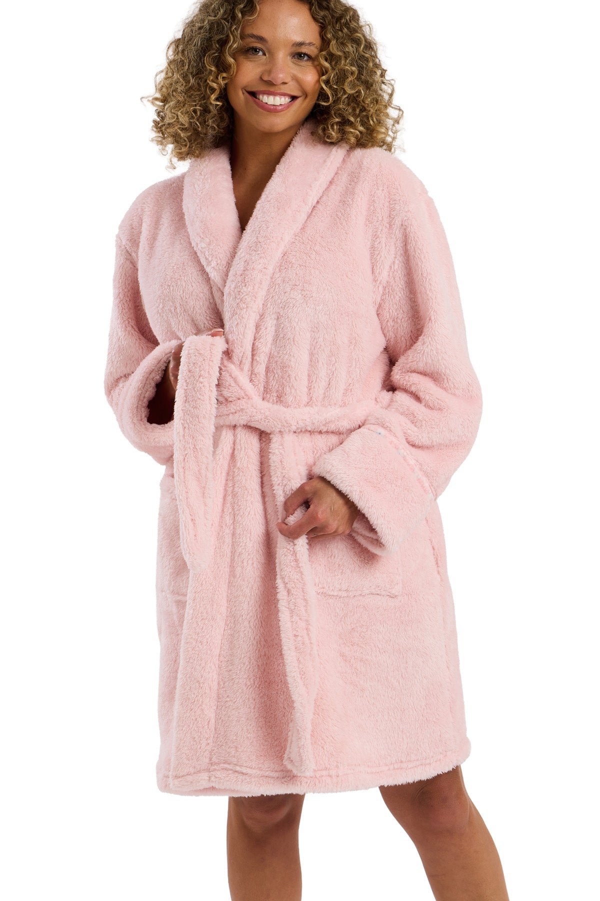 Wrap yourself in warmth with this thick and comfy knee length robe ; perfect for slow mornings, chilly evenings, and everything in between. With a classic shawl collar, tie belt, and roomy patch pockets, it’s got all the cosy essentials. The cuffs are finished with our pretty geometric print trim for a subtle pop of colour.