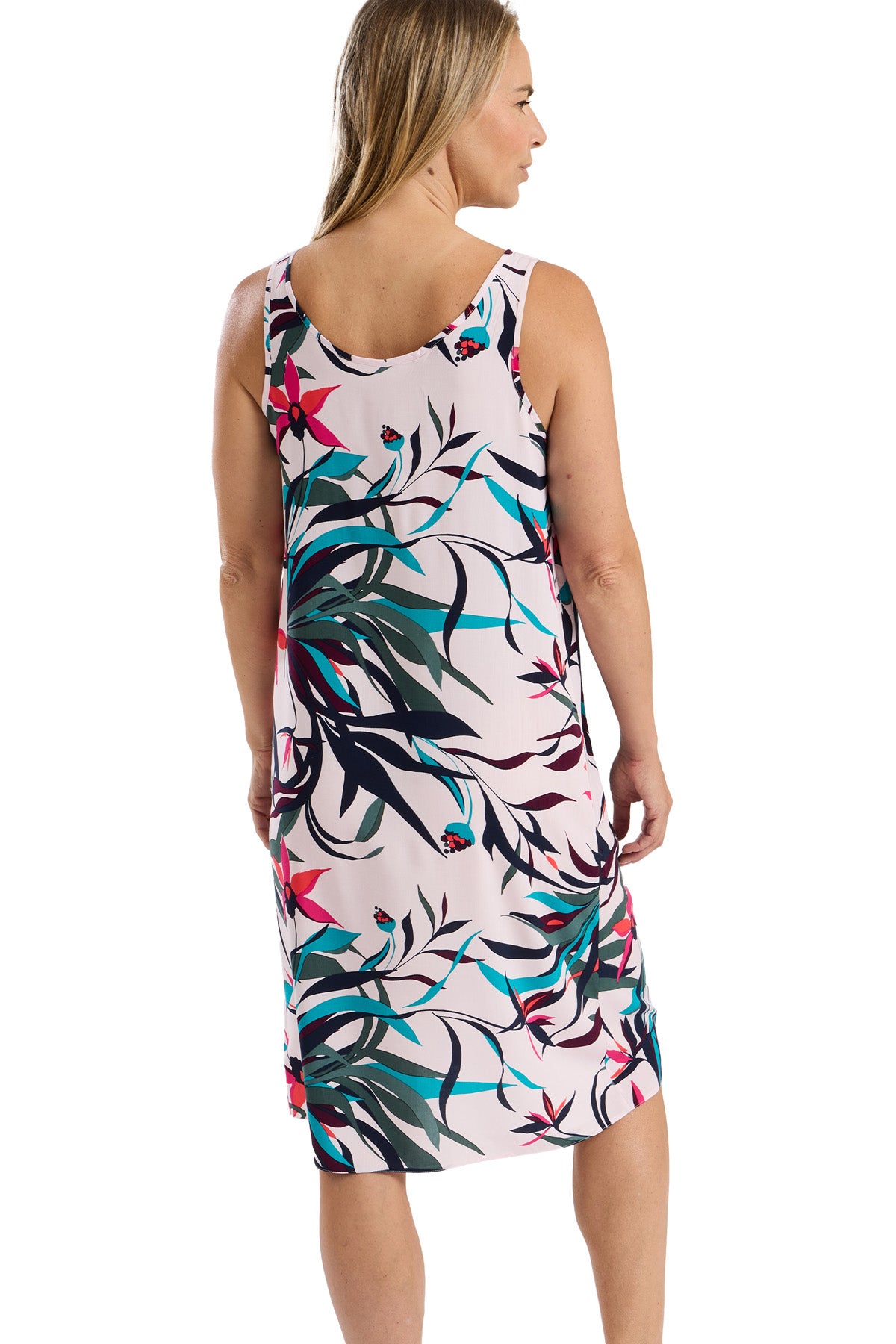 Introducing our Karina Keyhole Viscose Nightdress, designed to keep you cool and comfy throughout the year. This sleeveless nightdress features a contemporary shape and delicate pintuck details at the neckline for a refined look. The charming keyhole with a functional button adds subtle elegance, while the vibrant Tropical Floral print in teal, hot pink, and wine on a pale pink background brings a fresh, beautiful touch. For the best fit, consider sizing up if you have a fuller bust. Crafted from non-stretch woven viscose to showcase the print beautifully.