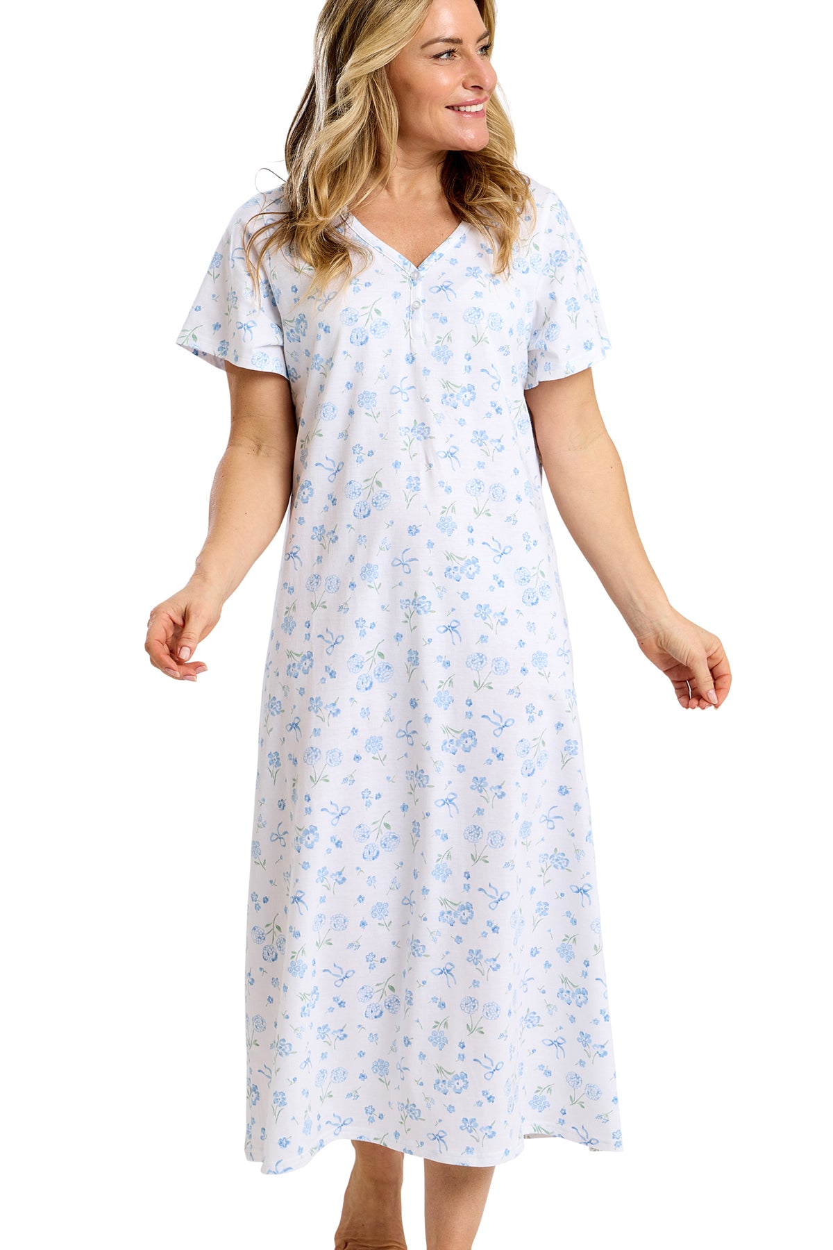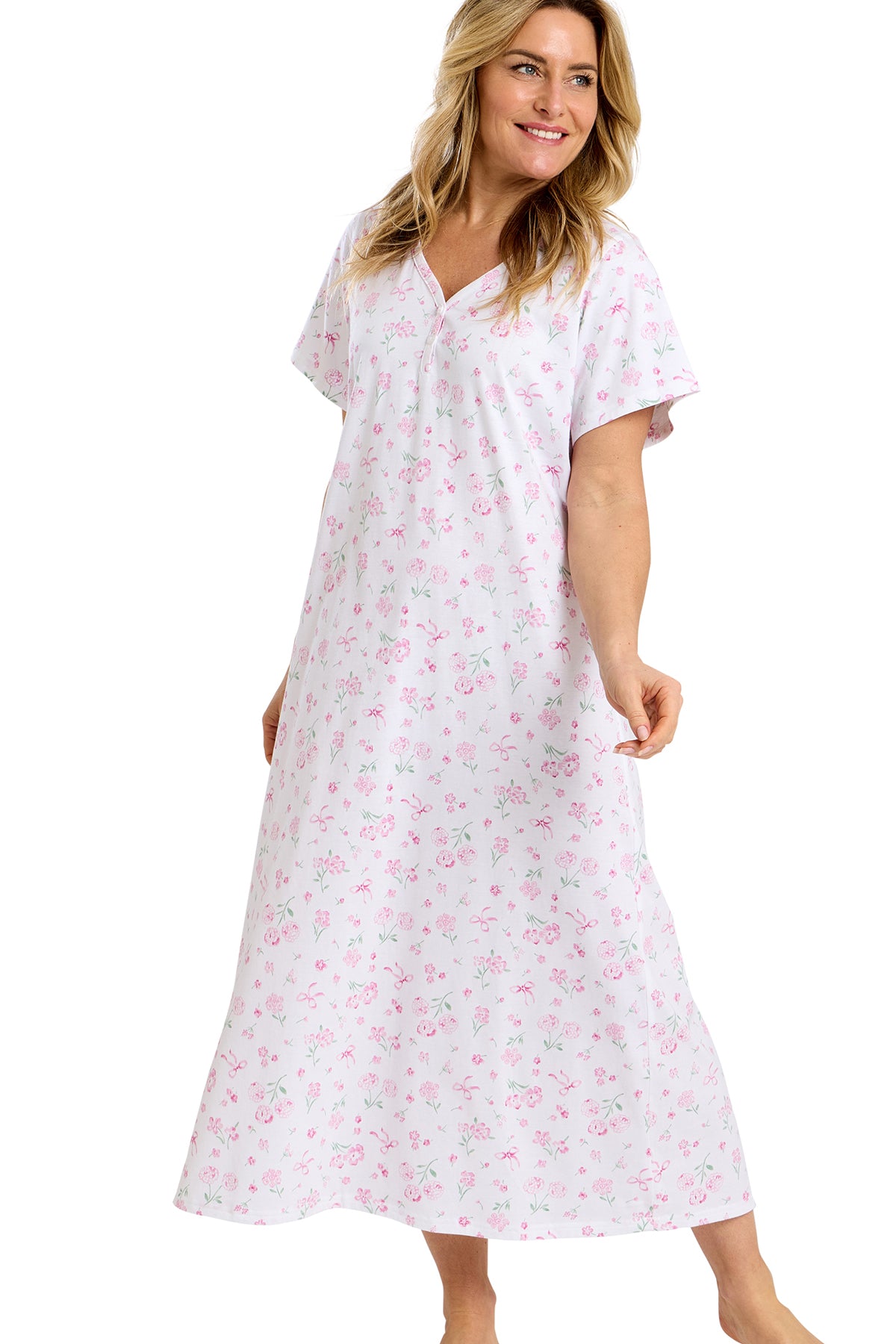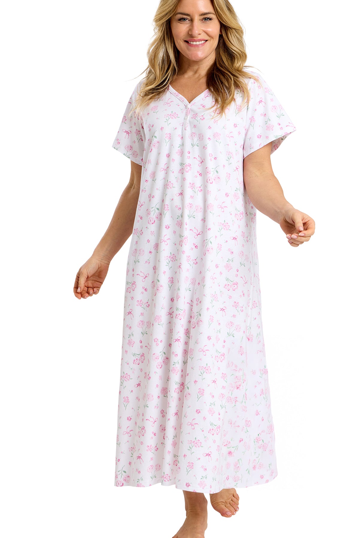 Look no further than our Spring Garden V Neck Soft Jersey Long Nightdress. Available in a variety of sizes , this nightdress combines comfort with timeless style. The flattering V-neckline features  functional buttons and the design is free from a yoke seam for added ease. Crafted from soft jersey fabric with short sleeves, it’s the perfect choice for effortless comfort.