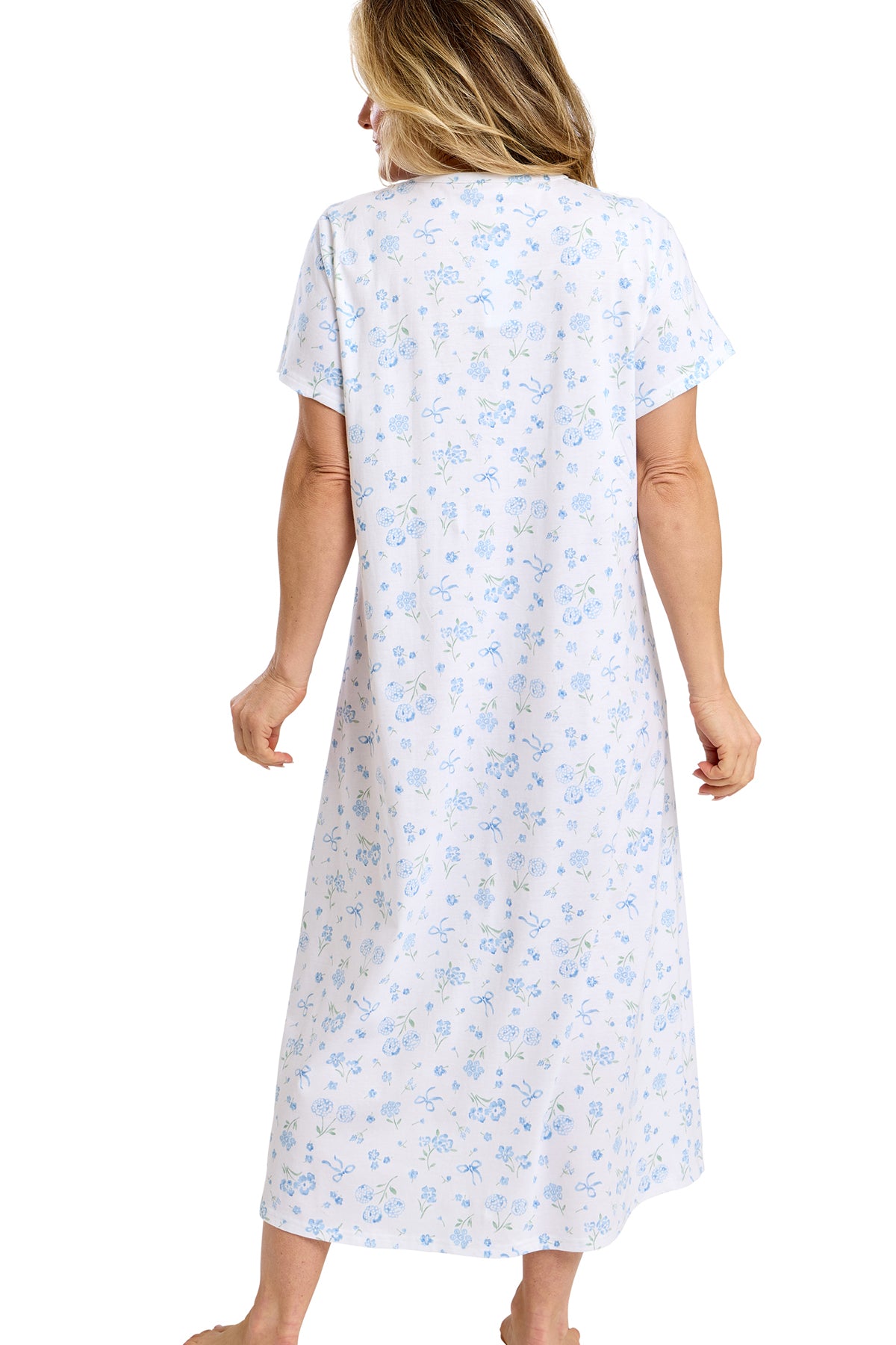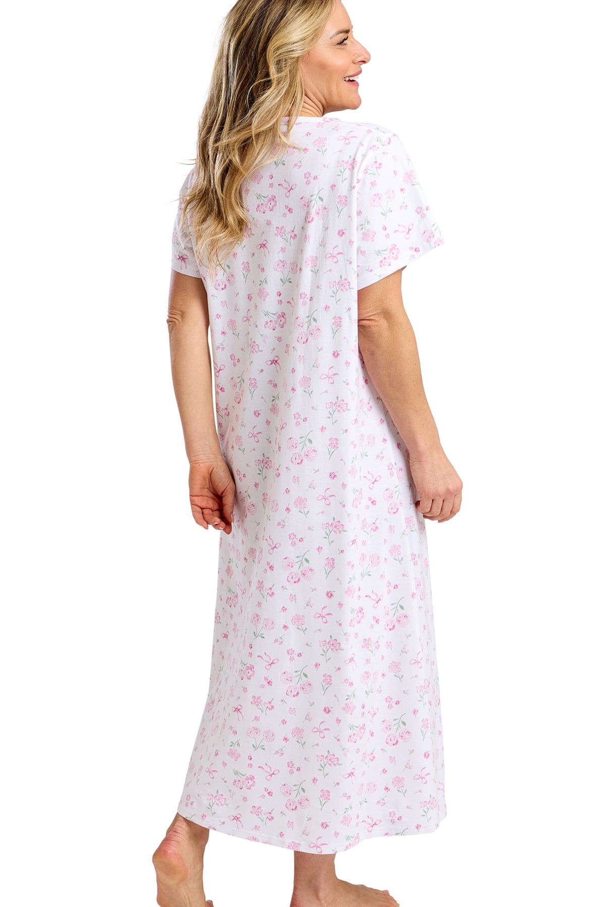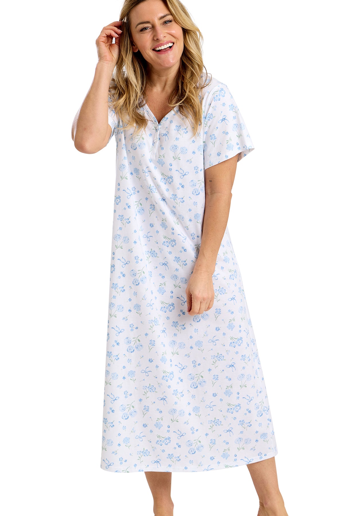 Look no further than our Spring Garden V Neck Soft Jersey Long Nightdress. Available in a variety of sizes , this nightdress combines comfort with timeless style. The flattering V-neckline features  functional buttons and the design is free from a yoke seam for added ease. Crafted from soft jersey fabric with short sleeves, it’s the perfect choice for effortless comfort.