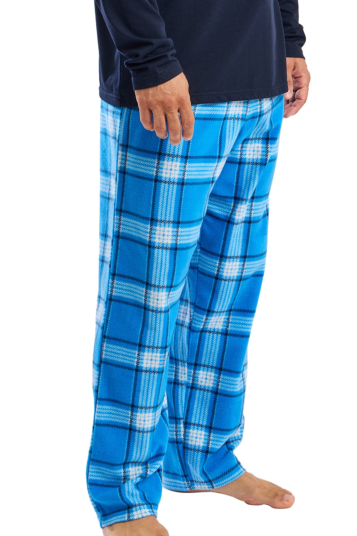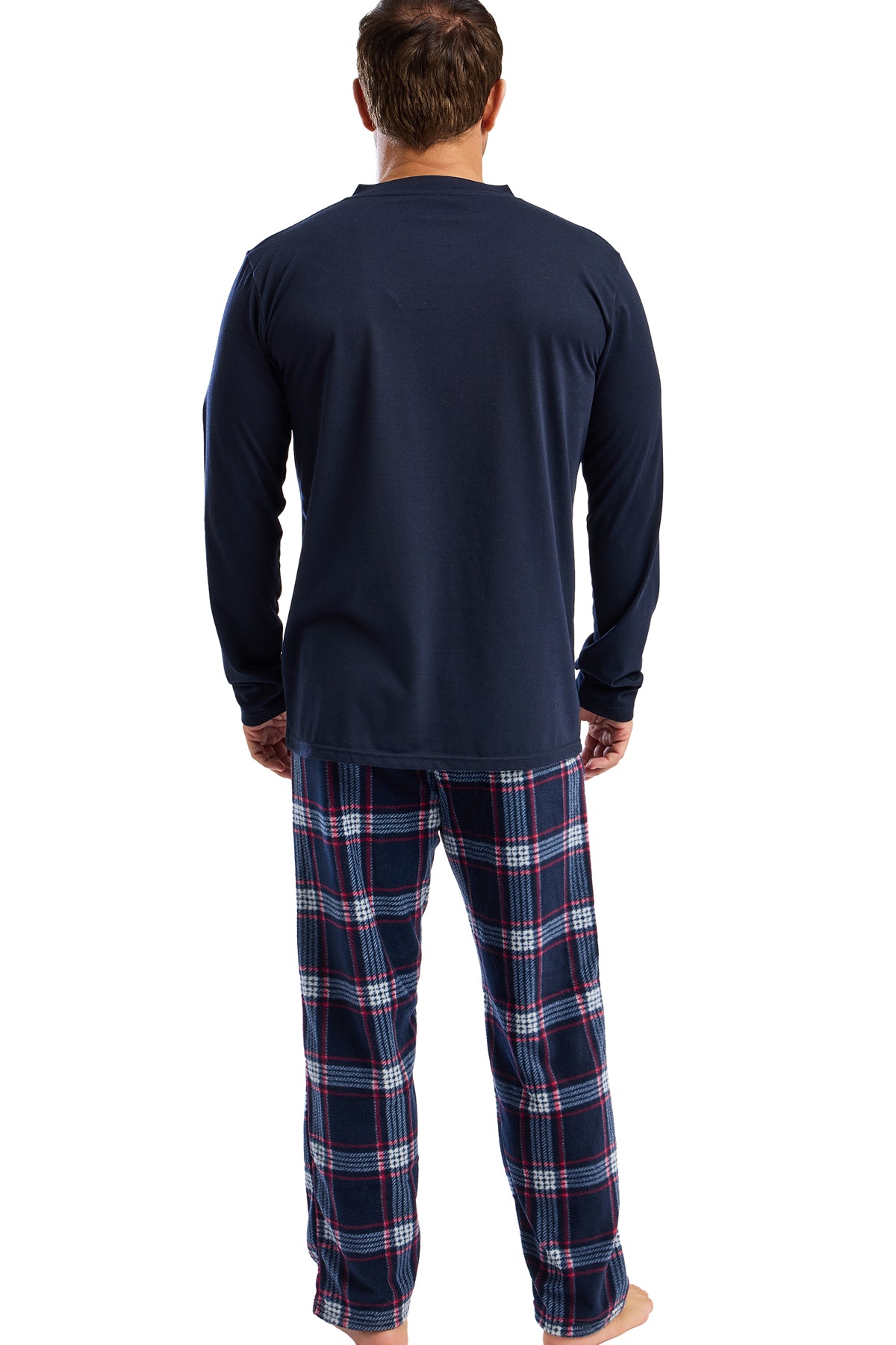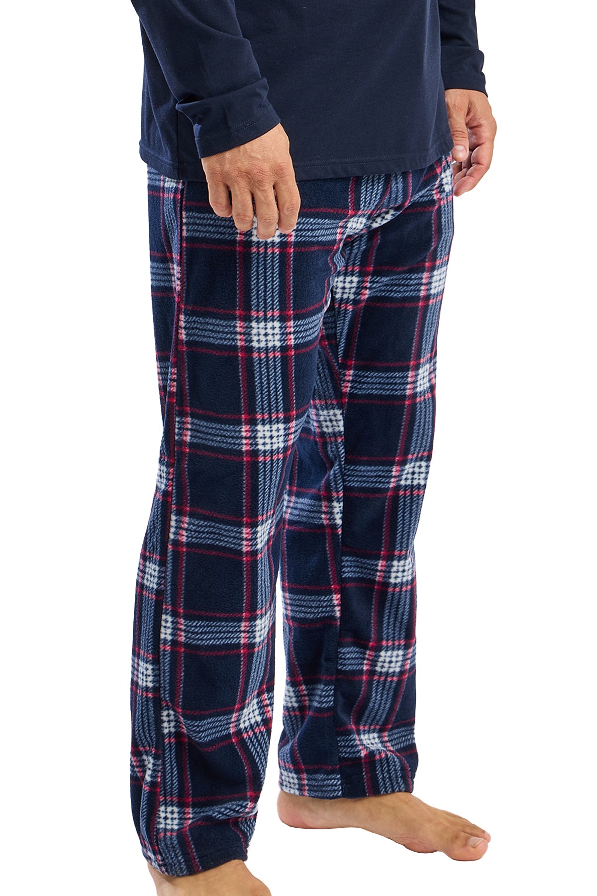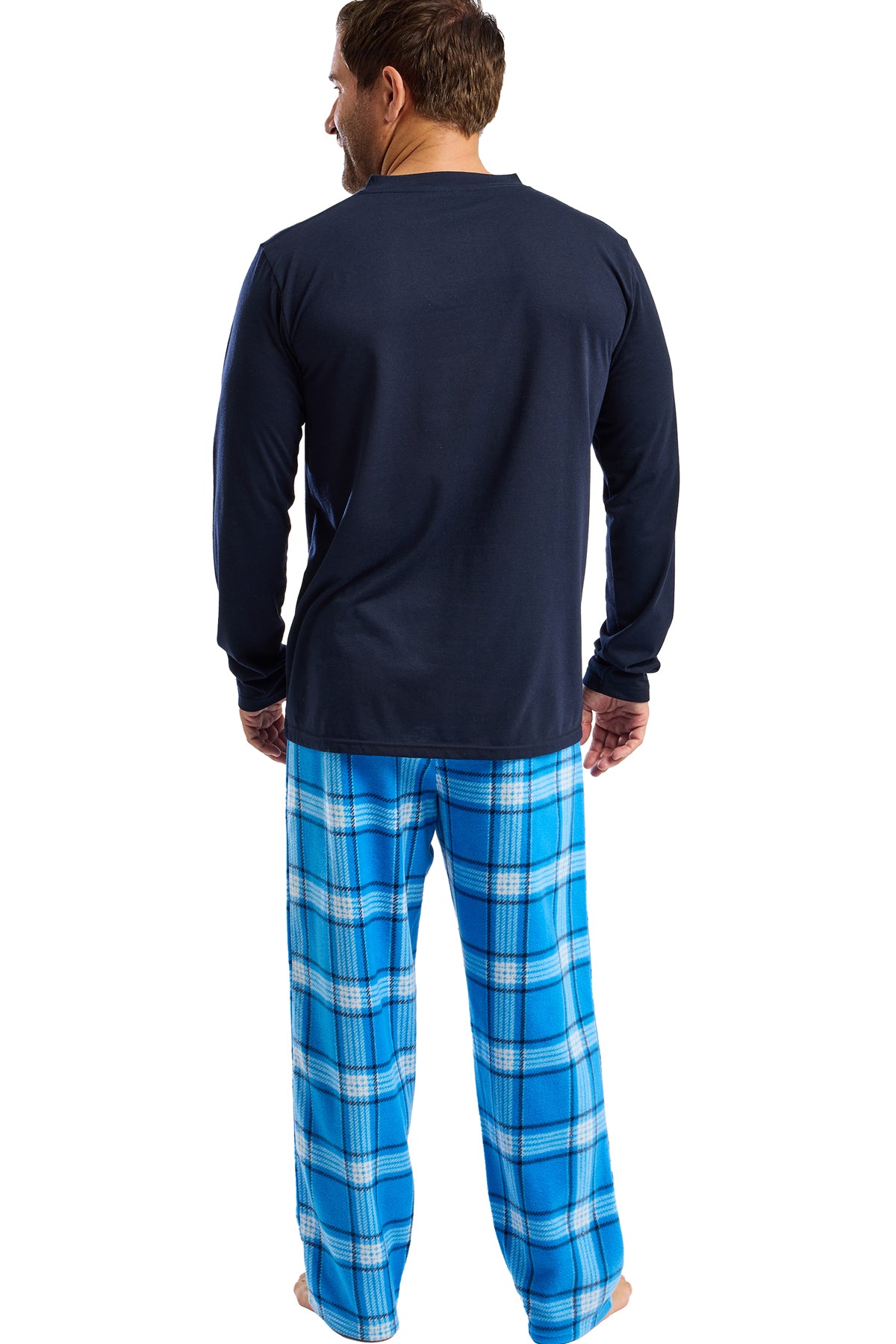 With a plain long sleeved top in easy-care knit polycotton & our cosy fleecy pull-on pants, he'll find our Blakeney  pj set for men comfy and so easy to wear.  We've a choice of 2 classic colourways of our check print, both mens pyjama options come complete with a matching navy top and he'll find the soft easy-care fabric washes like a dream.