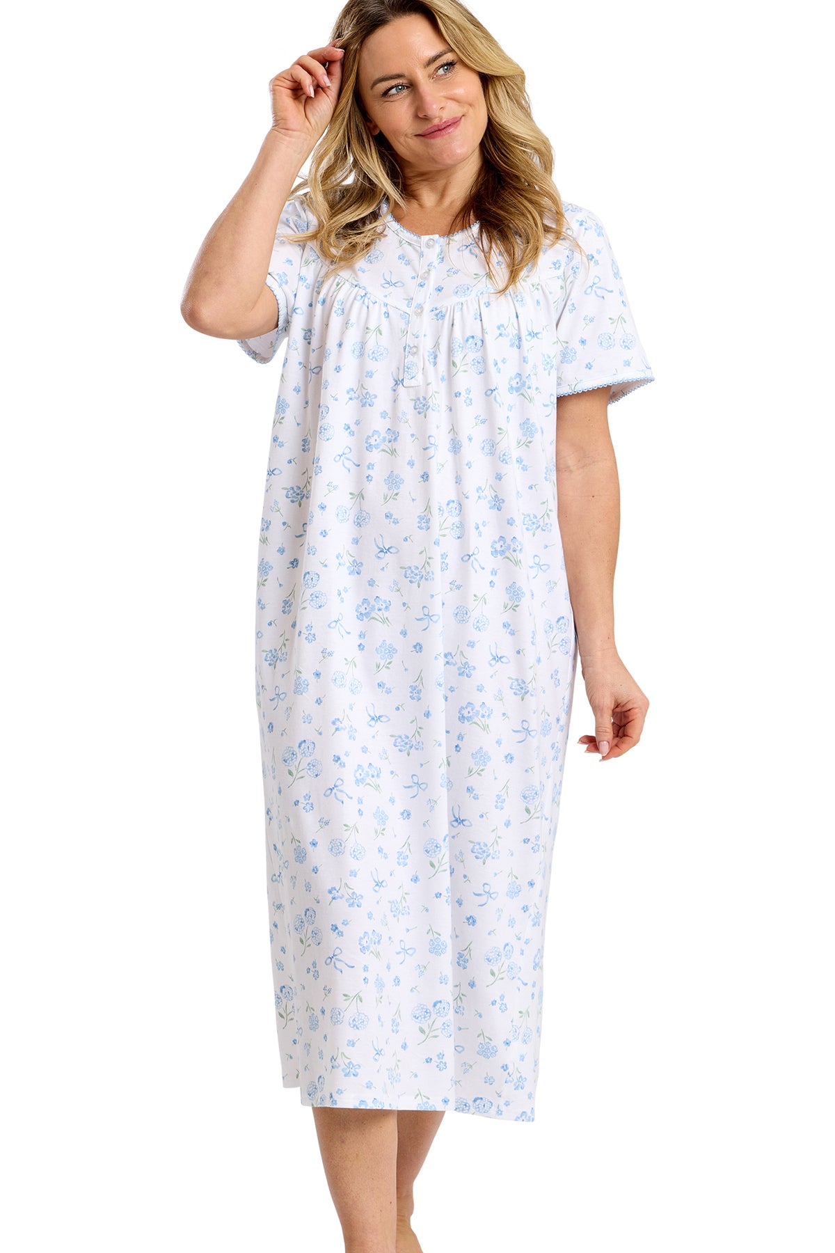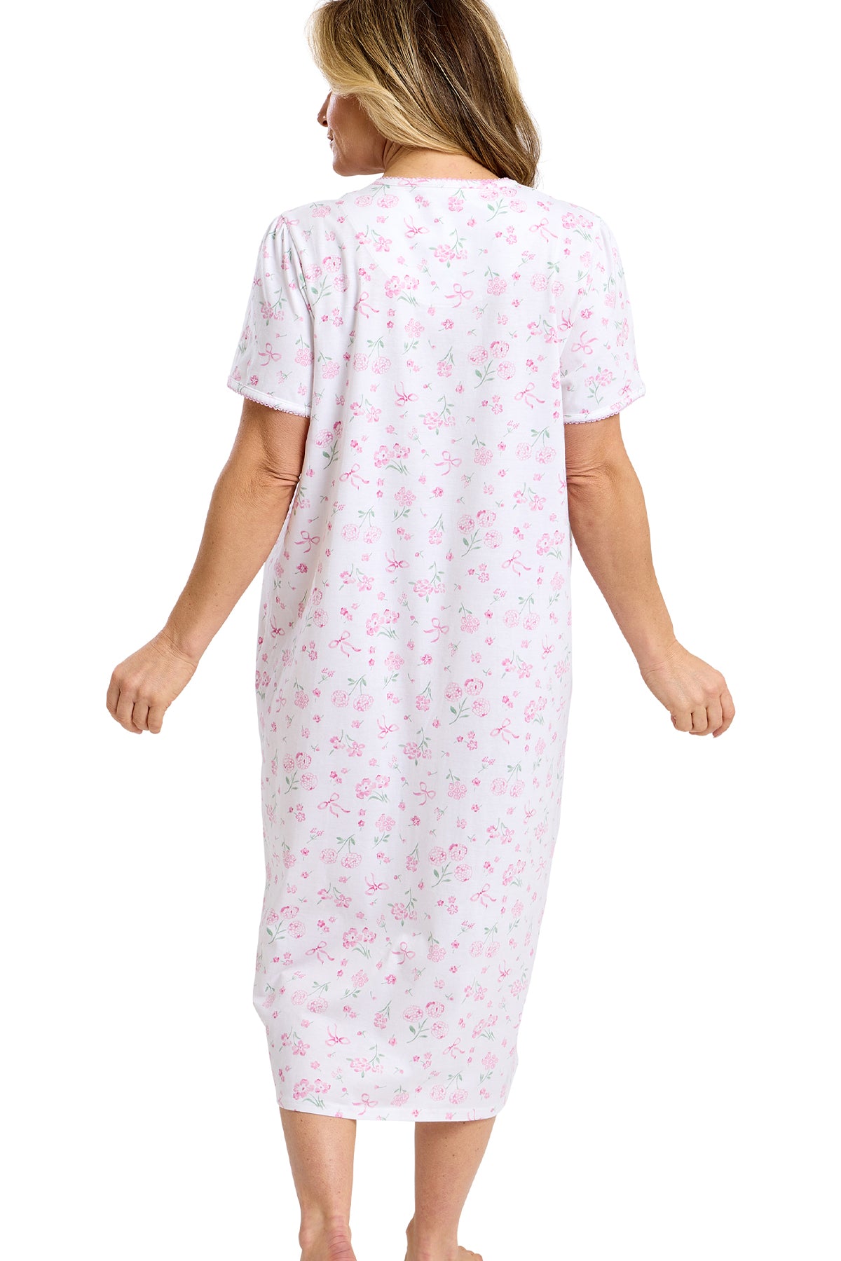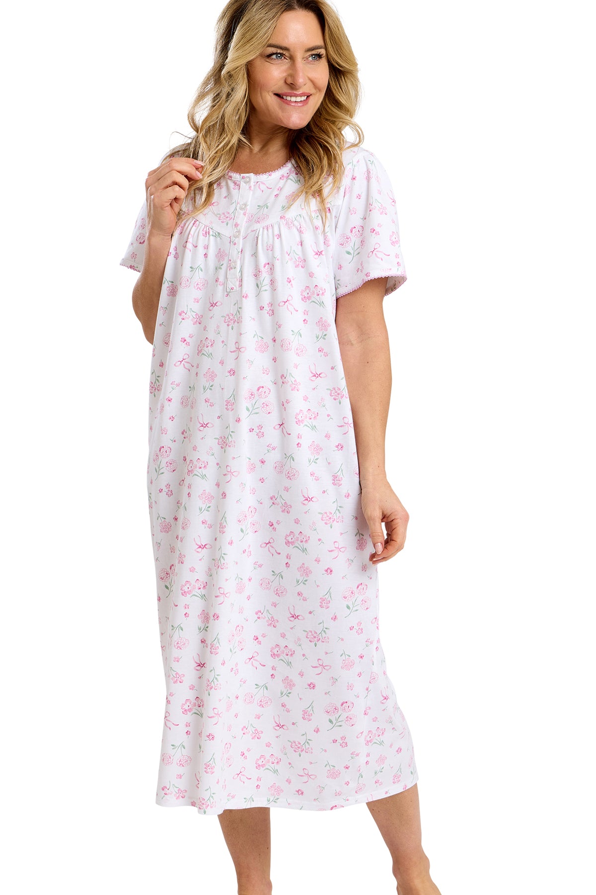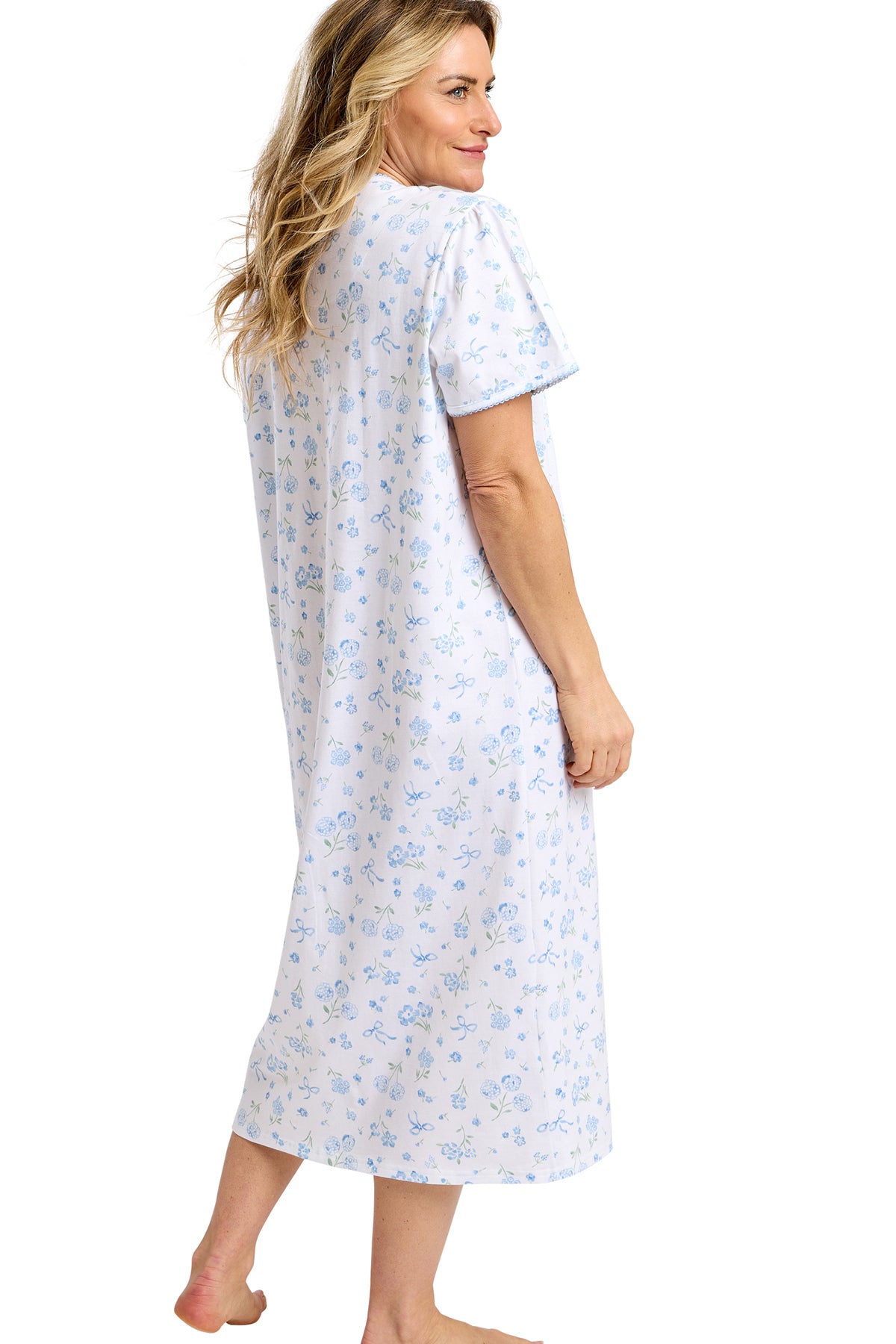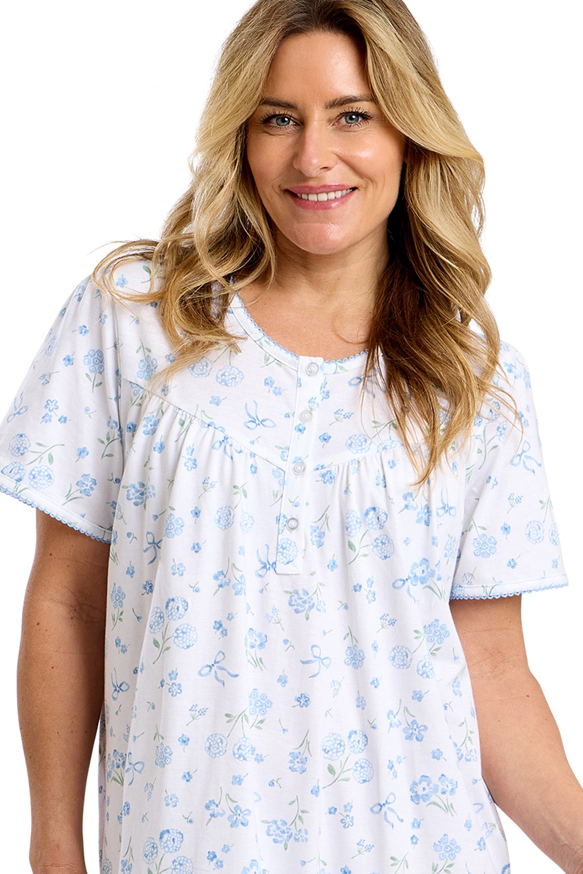Unwind in our timeless short‑sleeve nightdress, crafted from beautifully soft 100% cotton knitted jersey. The easy short button placket offers effortless wear, while delicate picot trims and a sweet ribbon bow bring charm to the yoke. Our Spring Garden print features watercolour florals and pretty bow motifs in pink or blue on a soft white base. Gentle gathers at the front create a flattering, flowing shape, and with no back seam, this nightdress is designed for pure comfort all night long.