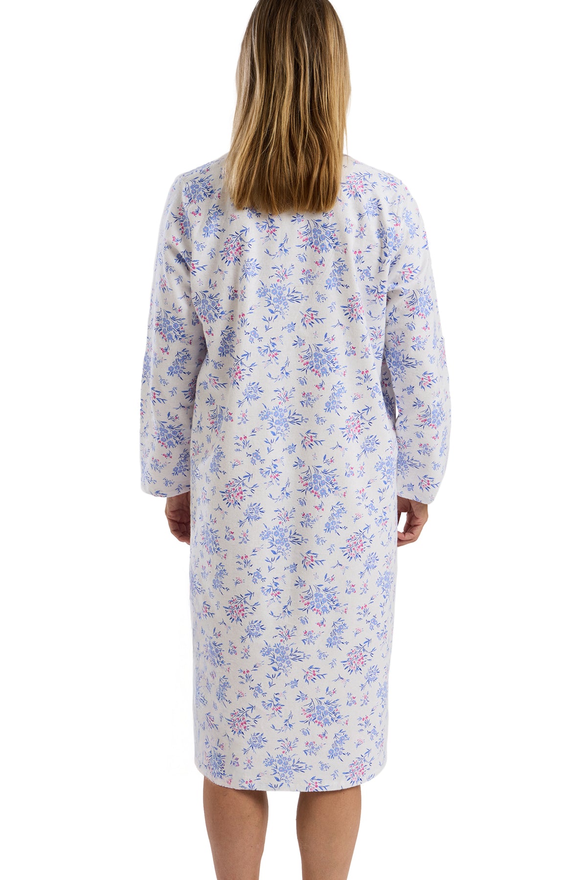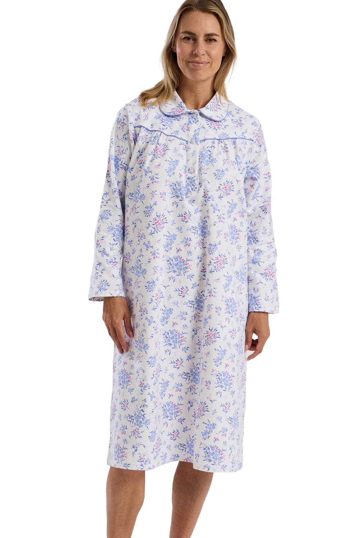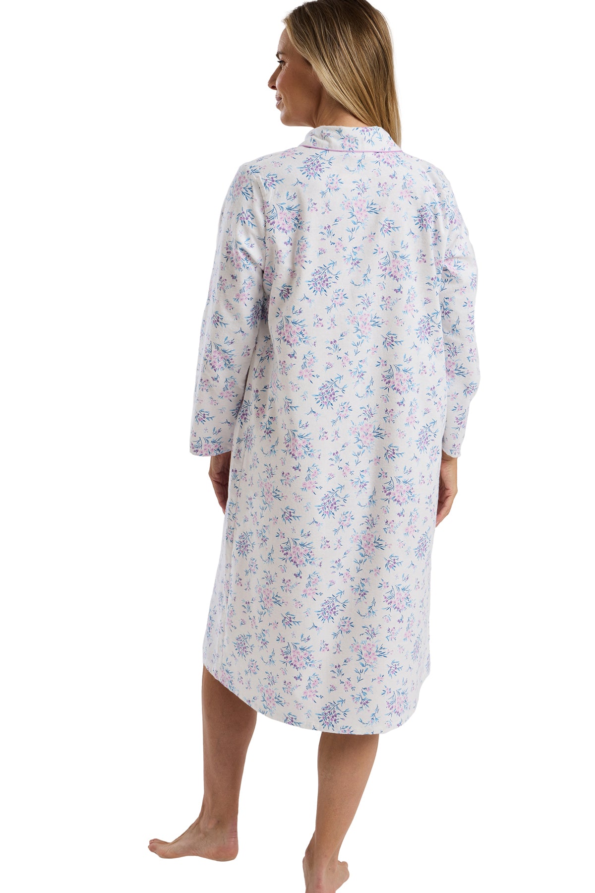 Crafted from 100% cotton winceyette, you'll love our delicate Floral Bouquet print in soft tones of Lavender or Blue. Finished with slim satin piping for a refined touch, this classic ladies nightdress is perfect for peaceful evenings and gentle mornings.
