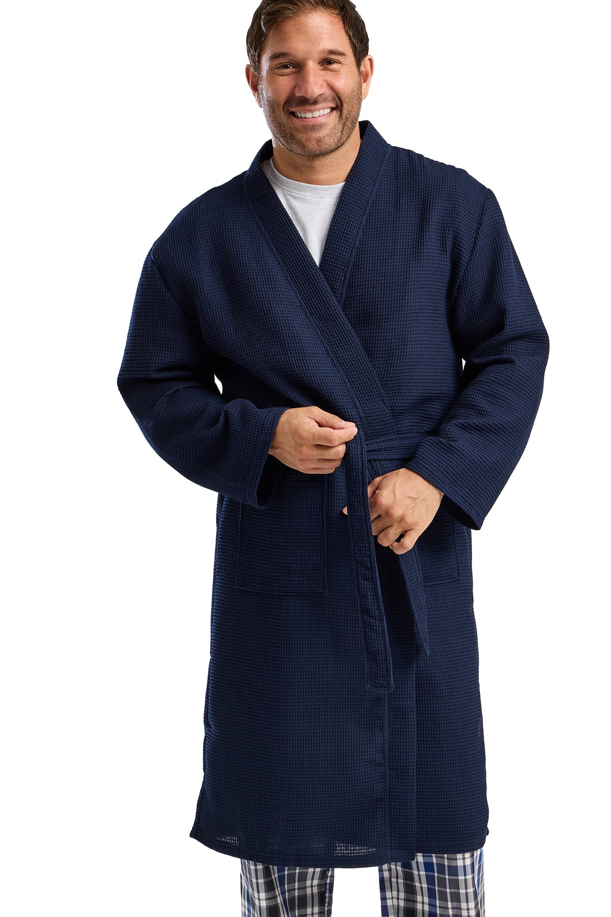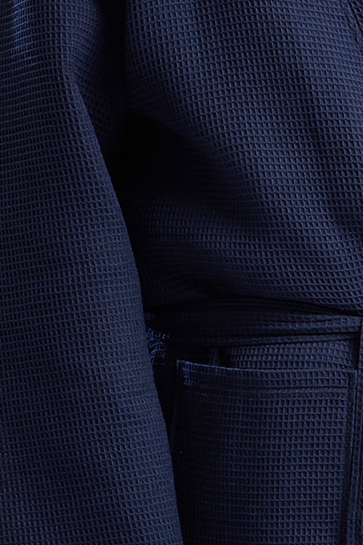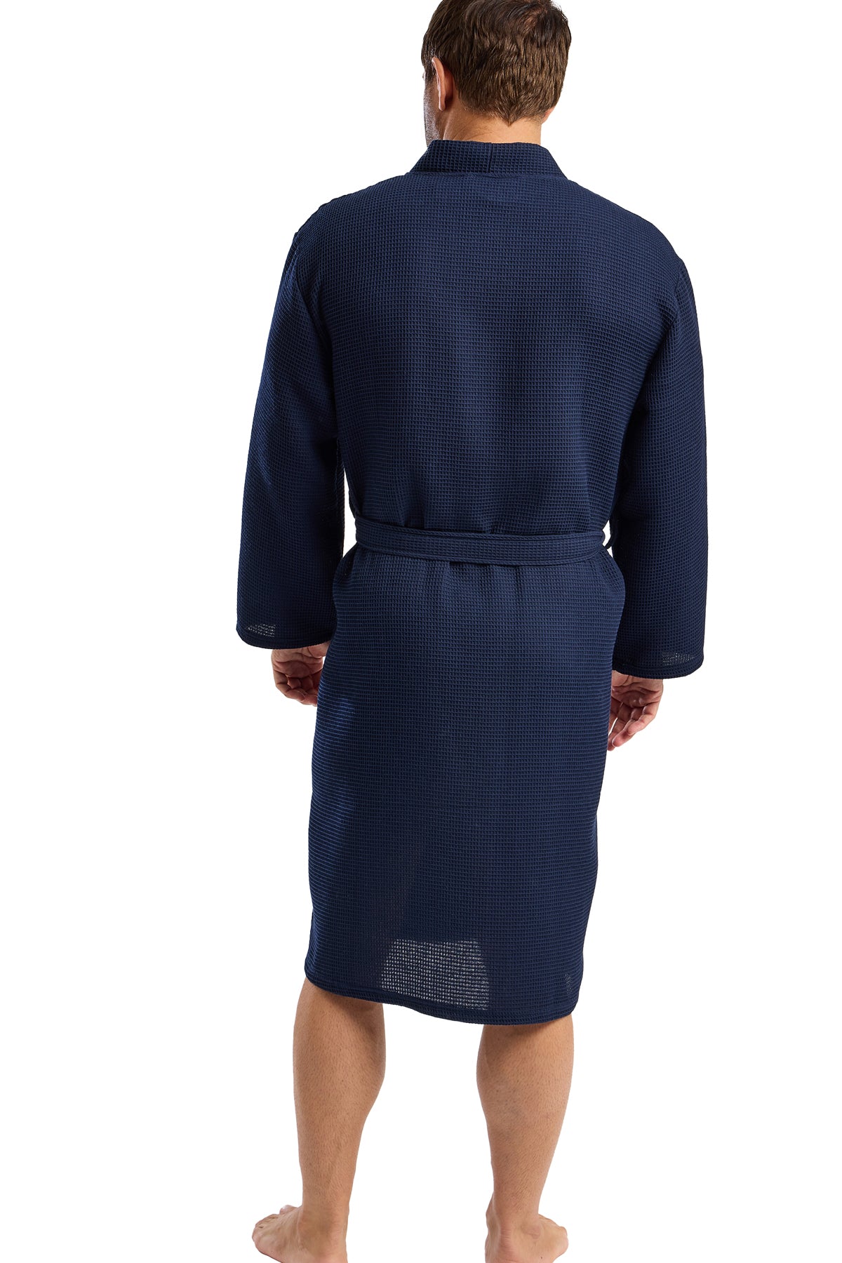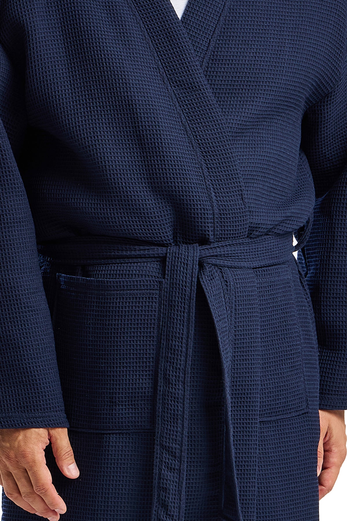 Expertly crafted from soft, breathable cotton with a rich waffle texture, our Helmsley robe offers a spa-like feel that’s perfect for unwinding after a shower or easing into the day. The classic kimono band neckline adds a sleek, tailored finish, while the lightweight fabric ensures comfort without compromise. A secure tie belt and internal ties provide a personalised fit, and two deep patch pockets keep essentials close. Finished in a timeless navy hue, this robe blends comfort & style—making every moment at home feel indulgent.