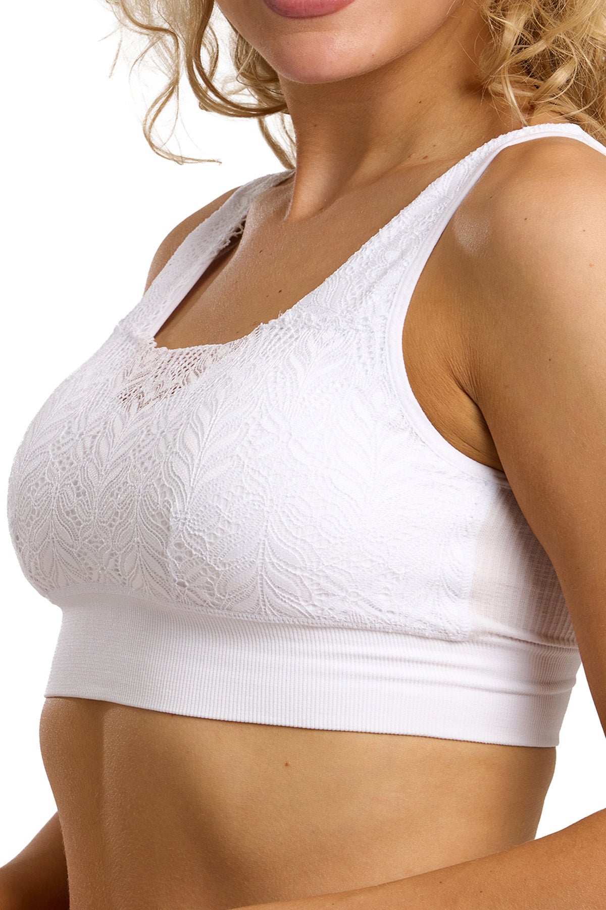 Our Kate wire‑free pack of 2 crop top set gives light, everyday support with a focus on comfort. Made from soft stretch fabric with  beautiful lace layers giving a camisole look. You'll love the smooth seamless finish, soft wide straps and removable supportive cup pads. With both classic black & white options in one great value multipack, our crop top set is an essential, feel‑good foundation for everyday comfort.